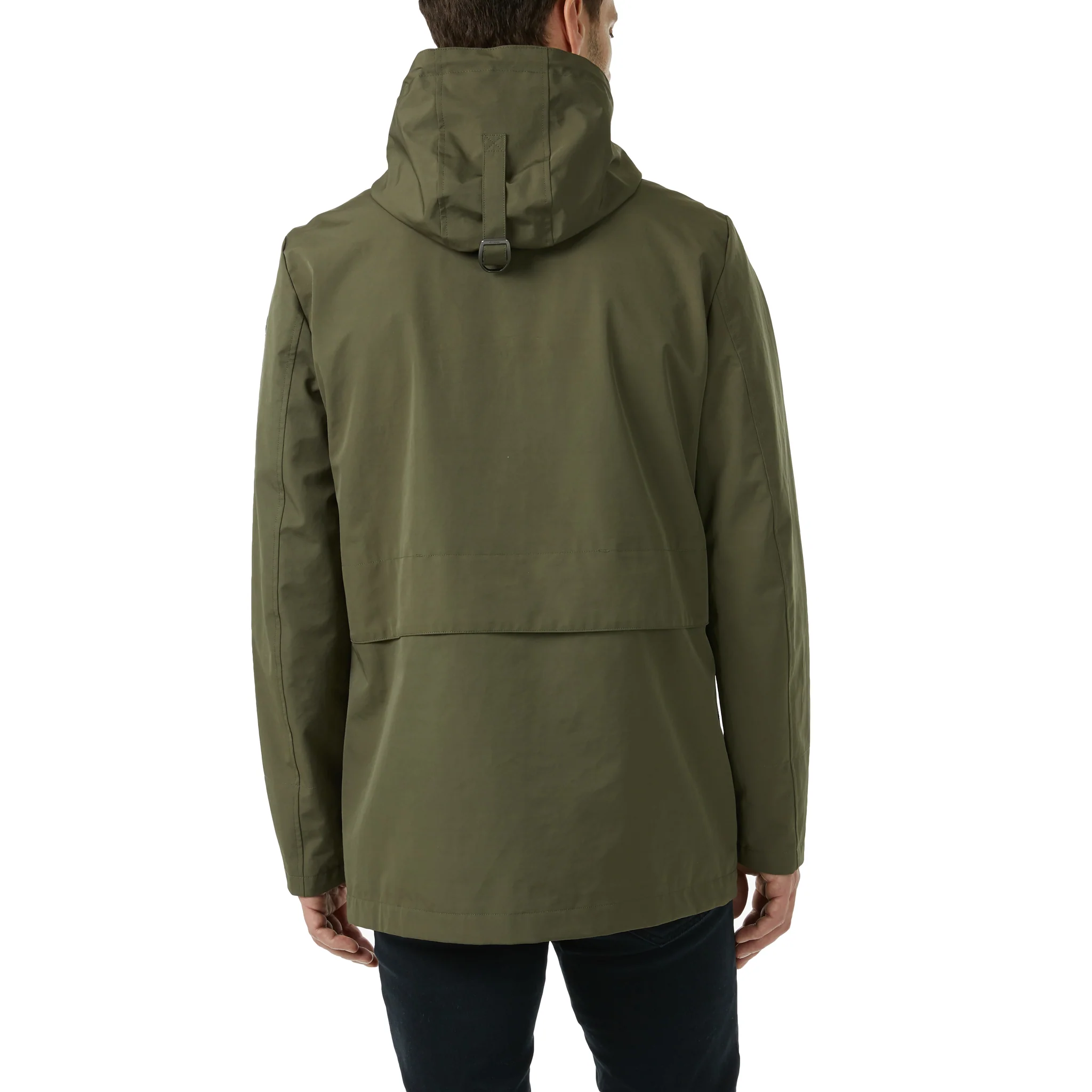 ACTIVE - Men’s raincoat. Removable hood. Front zip pockets. Zippered underarm ventilation. Back flange.